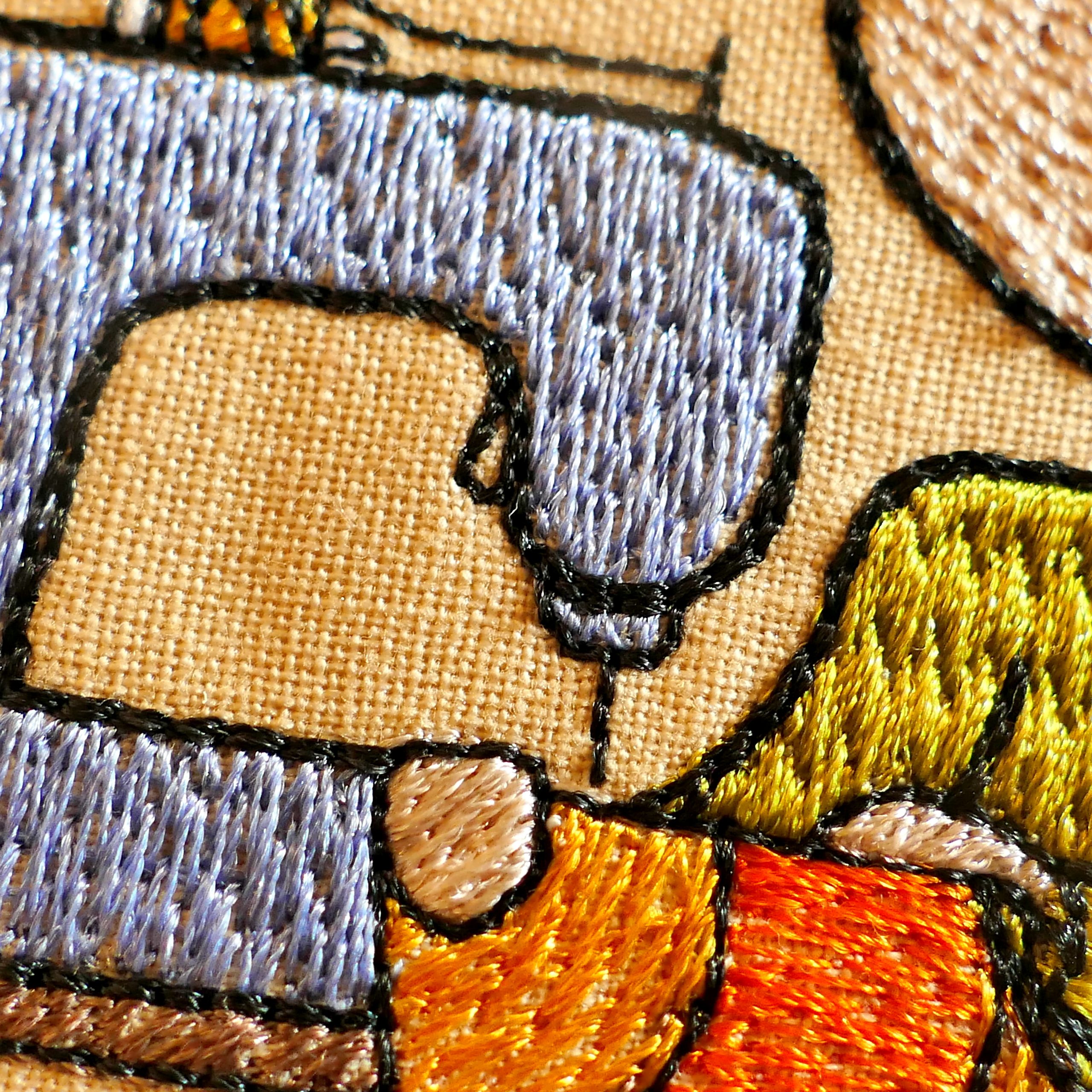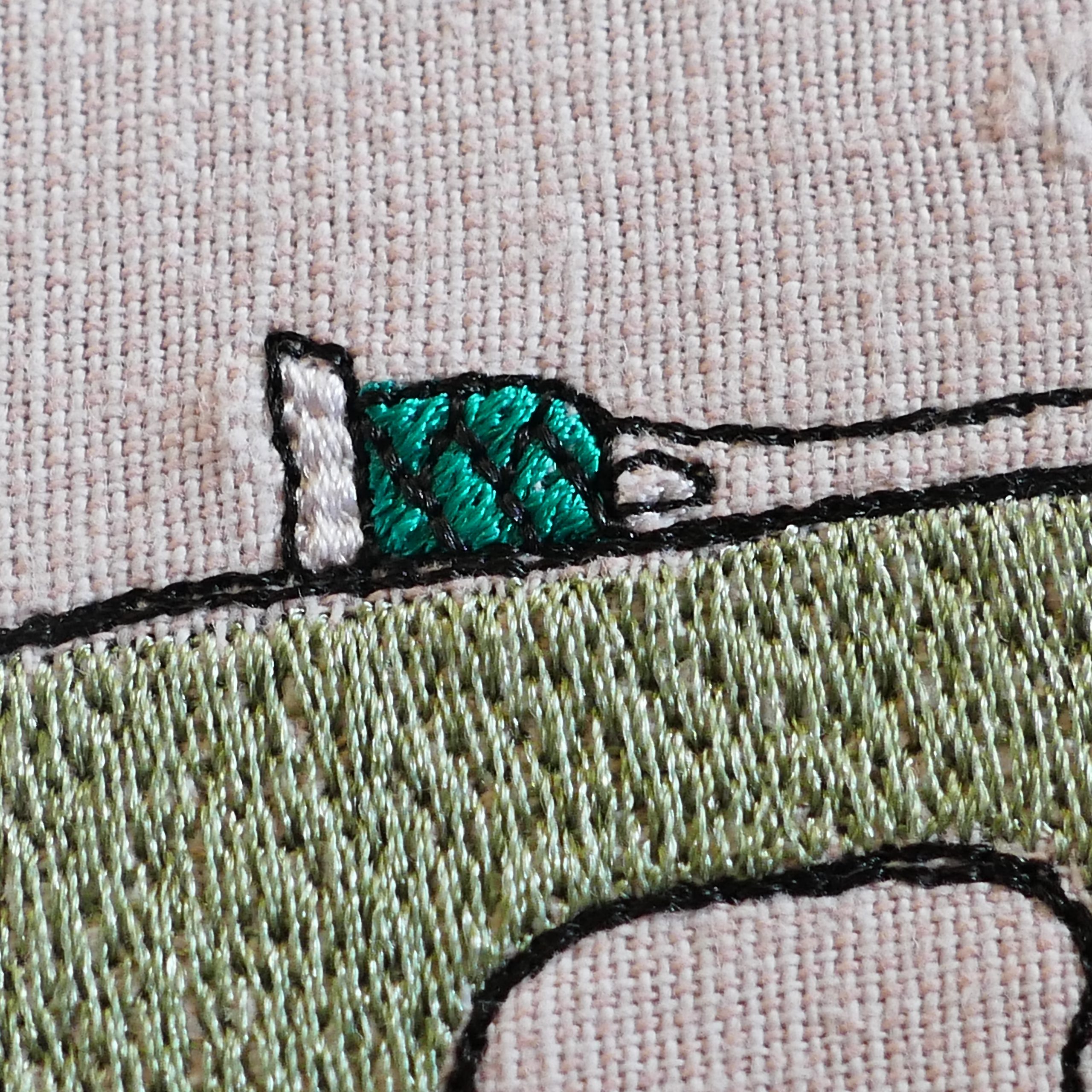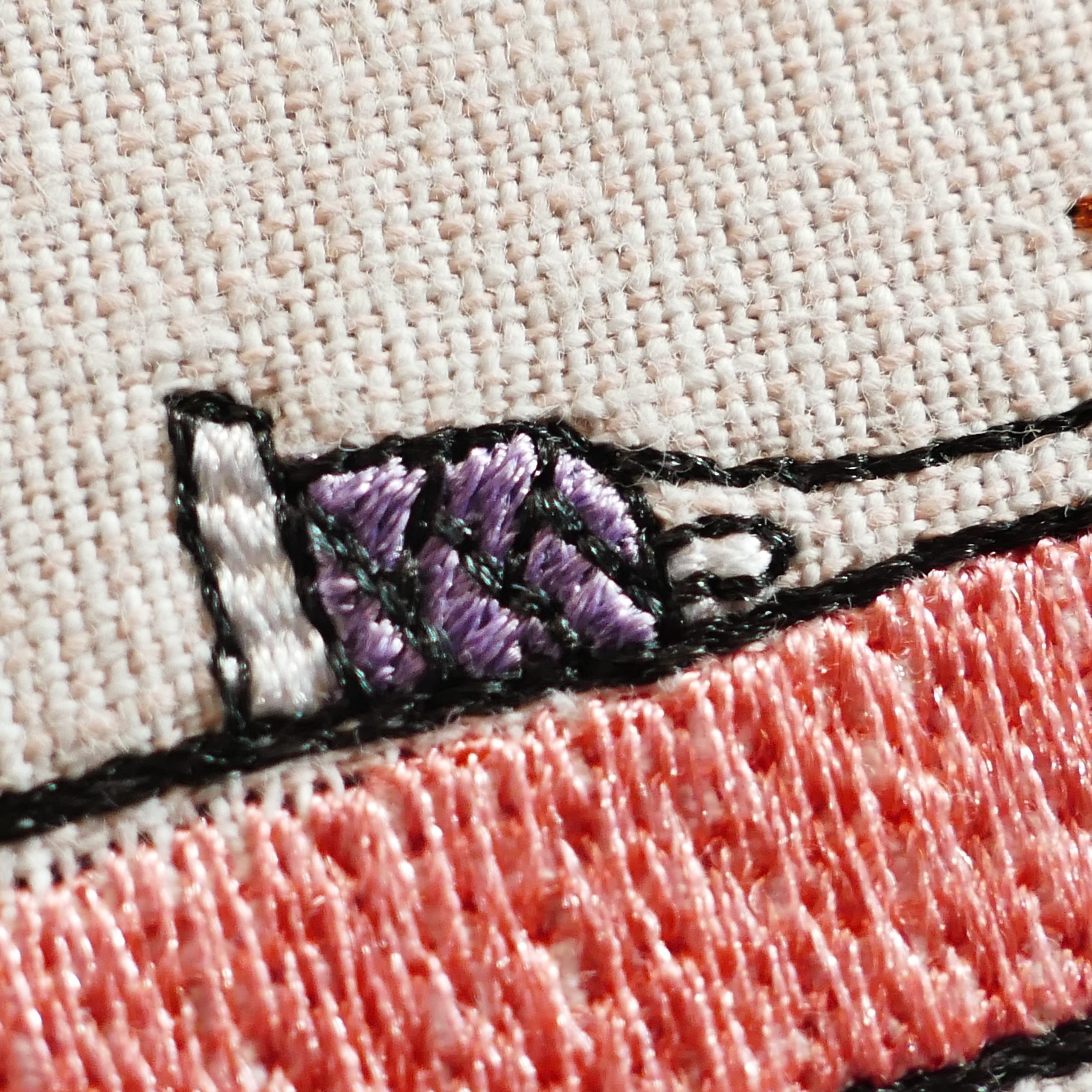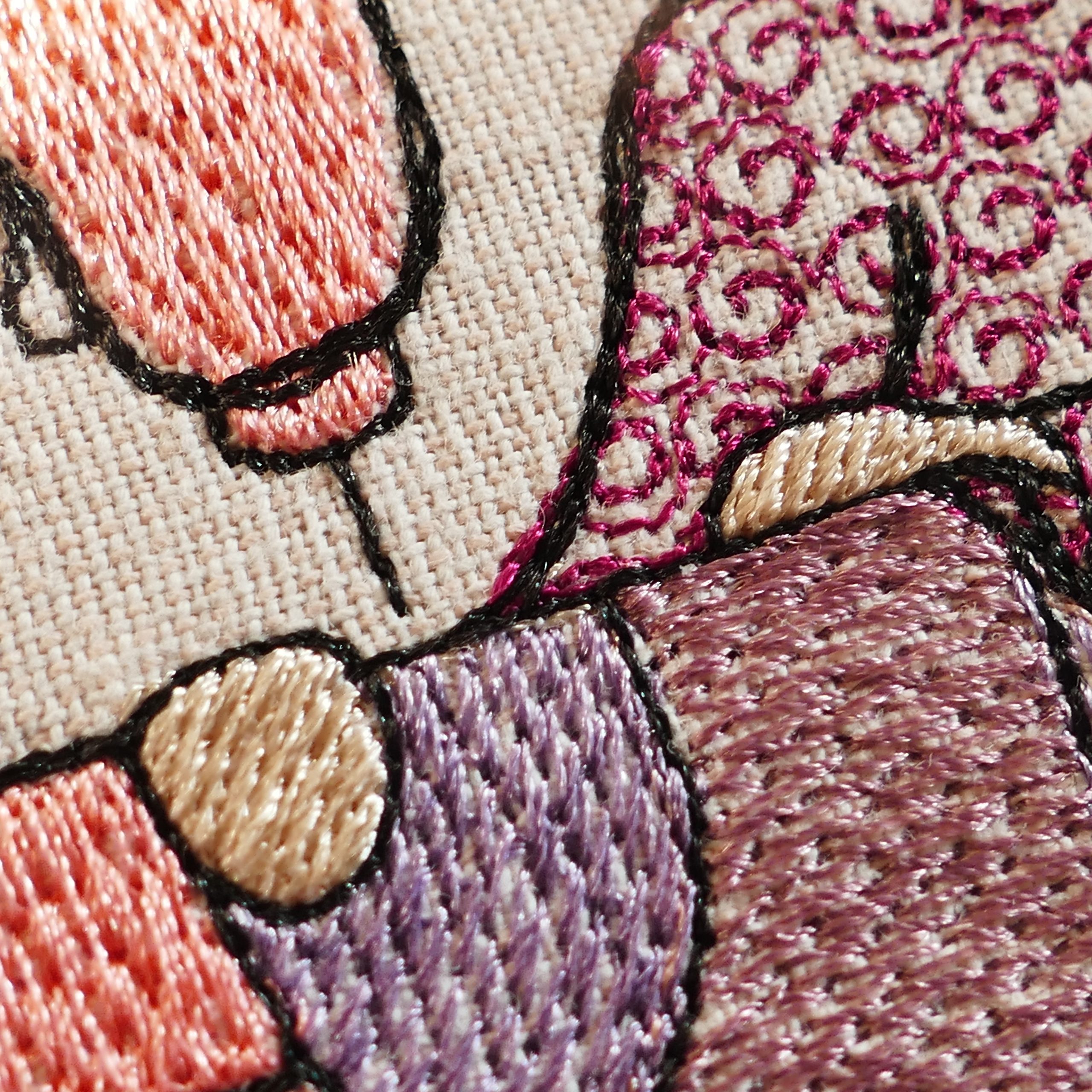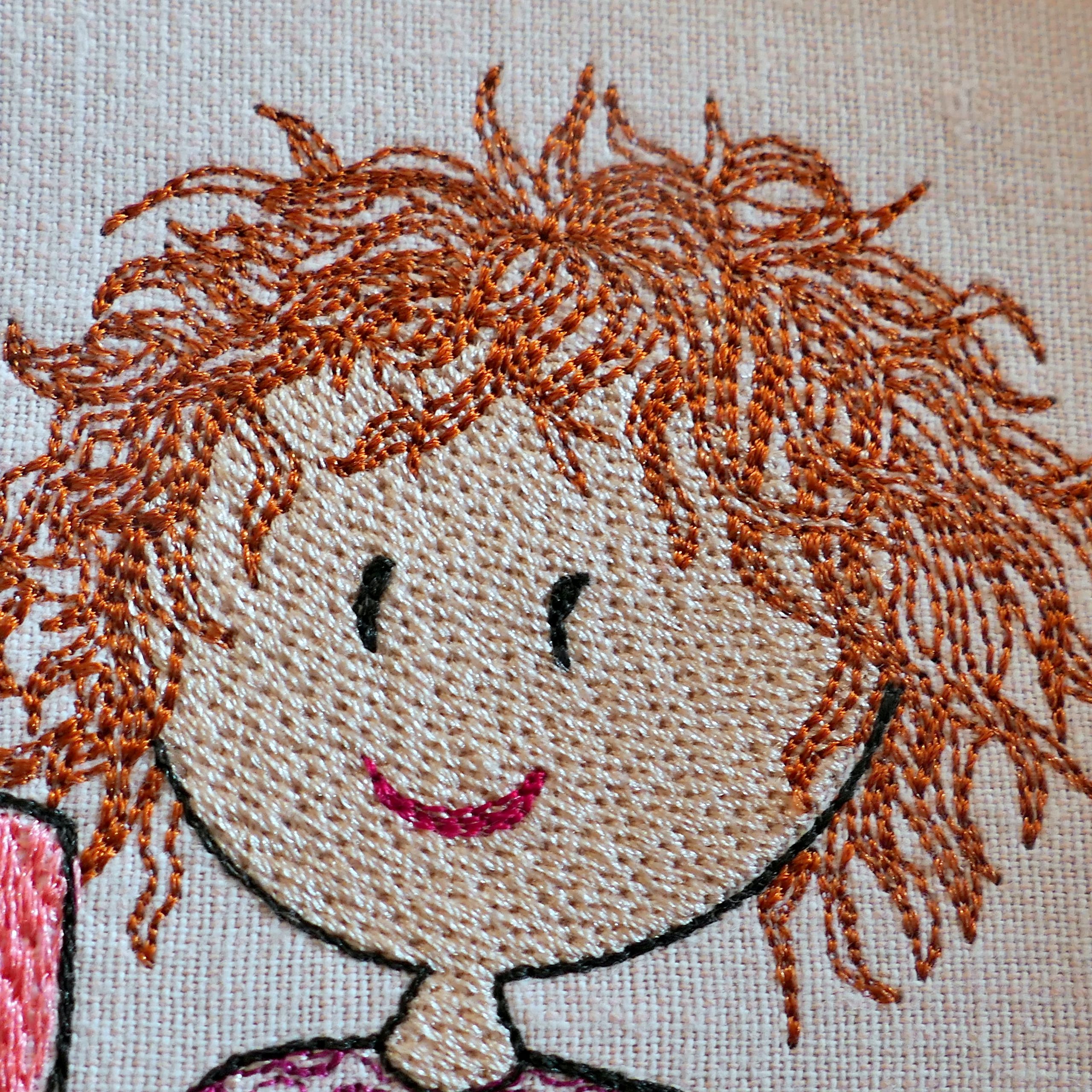 I recommend using slightly darker thread colours for Lilly’s hair colour (shades of reddish brown or brown). The hair consists of a fine line sequence that is adapted to the shape of Lilly’s head/face. If the hair colour is too light, the motif will no longer look coherent – an absolute no-go!