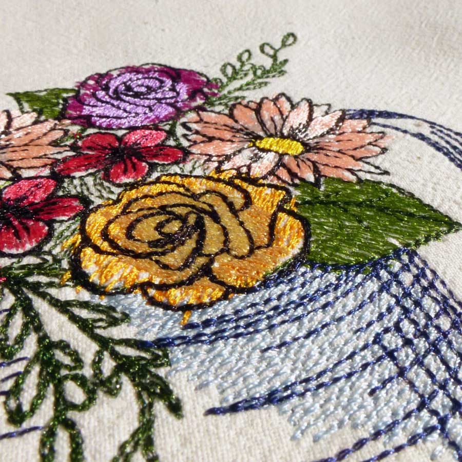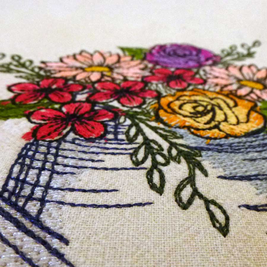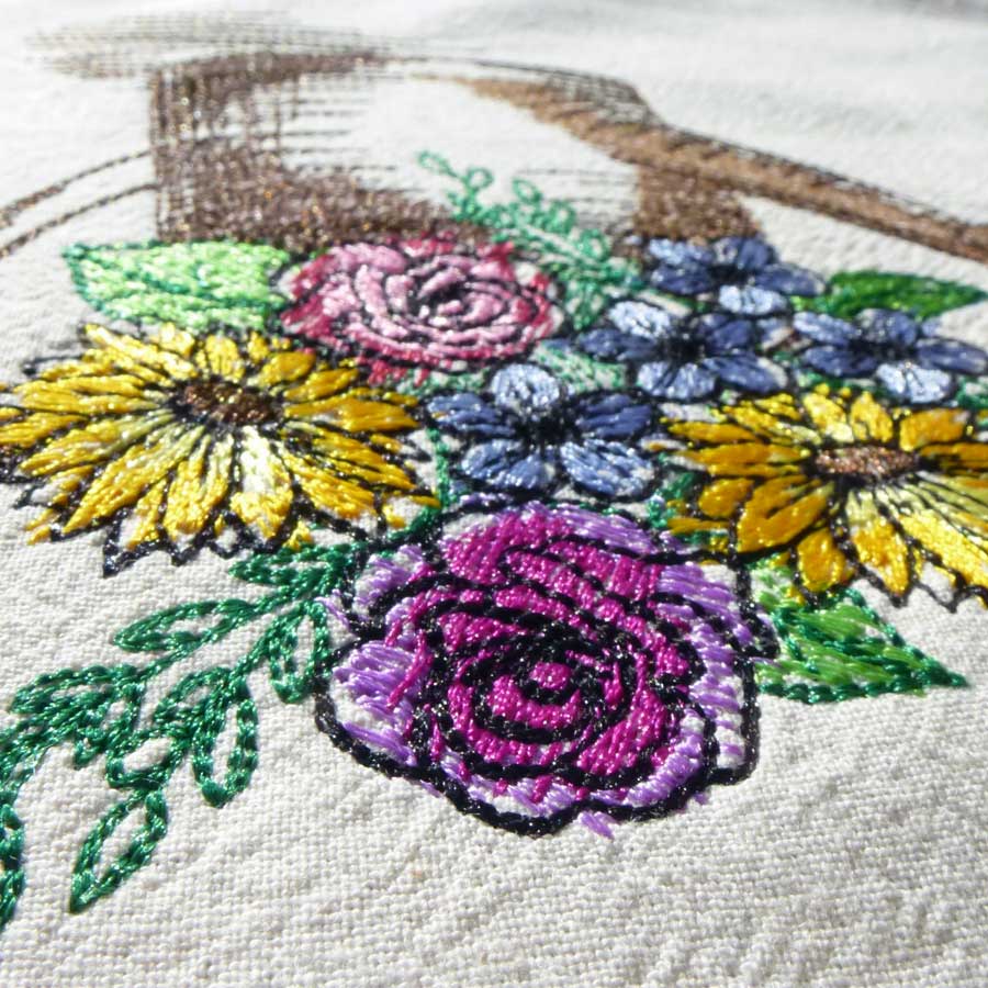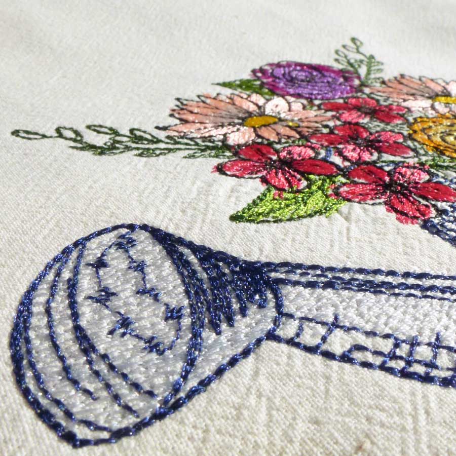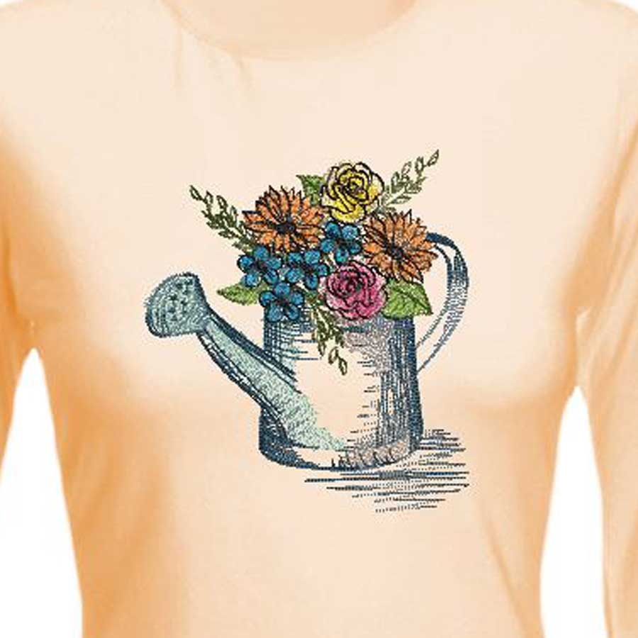 Machine embroidery Watering can with spring flowers
